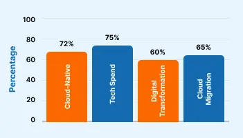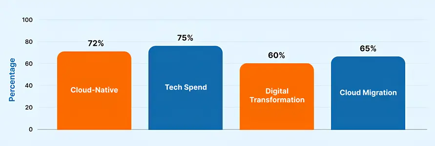 In the TEKsystems 2025 survey, 72% of organizations say cloud-native platforms are already in use. Same report says about 75% of digital leaders plan to increase spending on tech initiatives this year.